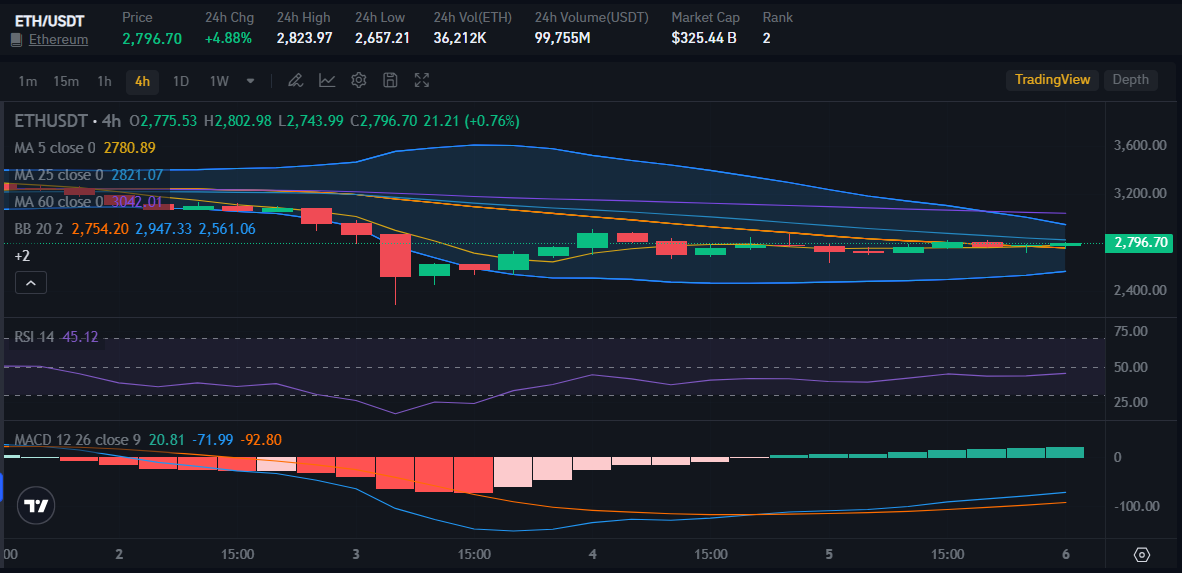 Following this post, Ethereum’s price began to recover. ETH price increased by 4.88% and is now trading at $2,796. However, despite the increase in price, the RSI and MACD indicators actually show a decrease which indicates a bearish trend.