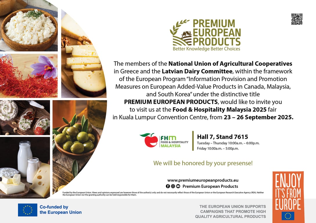 Produk premium dari Greece dan Latvia menjadi tumpuan di Food & Hotel Malaysia (FHM) 2025, dengan penekanan terhadap kualiti, tradisi dan kelestarian. Greece membawakan minyak zaitun, keju, serta produk yang diperakui di bawah label Protected Designation of Origin (PDO), manakala Latvia menampilkan produk beri semula jadi, madu, tenusu dan roti rai. Barisan produk autentik ini sejajar dengan permintaan pasaran Malaysia terhadap ramuan yang telus dari segi sumber dan diperoleh secara lestari.